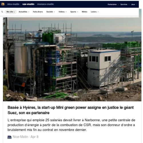 Alors qu’elle venait d’annoncer une nouvelle levée de fonds, la start-up hyéroise Mini green power spécialisée dans la conception de petites centrales de production d’énergie à partir de la combustion de déchets, et notamment les CSR (combustible solide de recyclage), se lance dans une guerre contre le géant de la gestion de l’eau et des déchets (40 000 collaborateurs, présent dans 40 pays), Suez. (...)